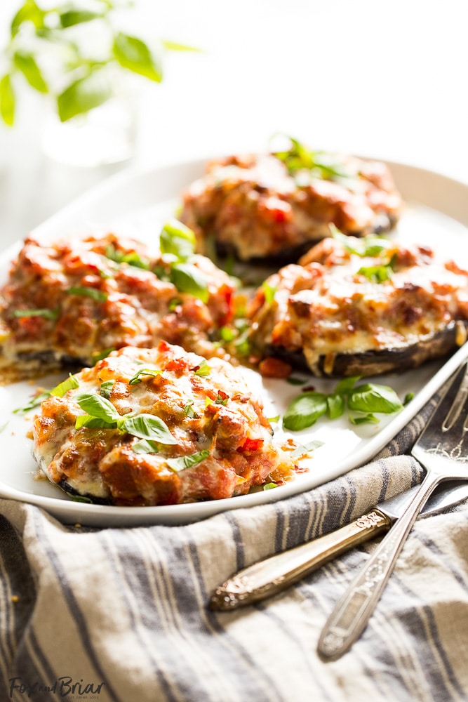 These Sausage Stuffed Portobello Mushrooms are a delìcìous low carb dìnner! A savory sausage tomato sauce topped wìth gooey, melty cheese on top of an umamì portobello mushroom!